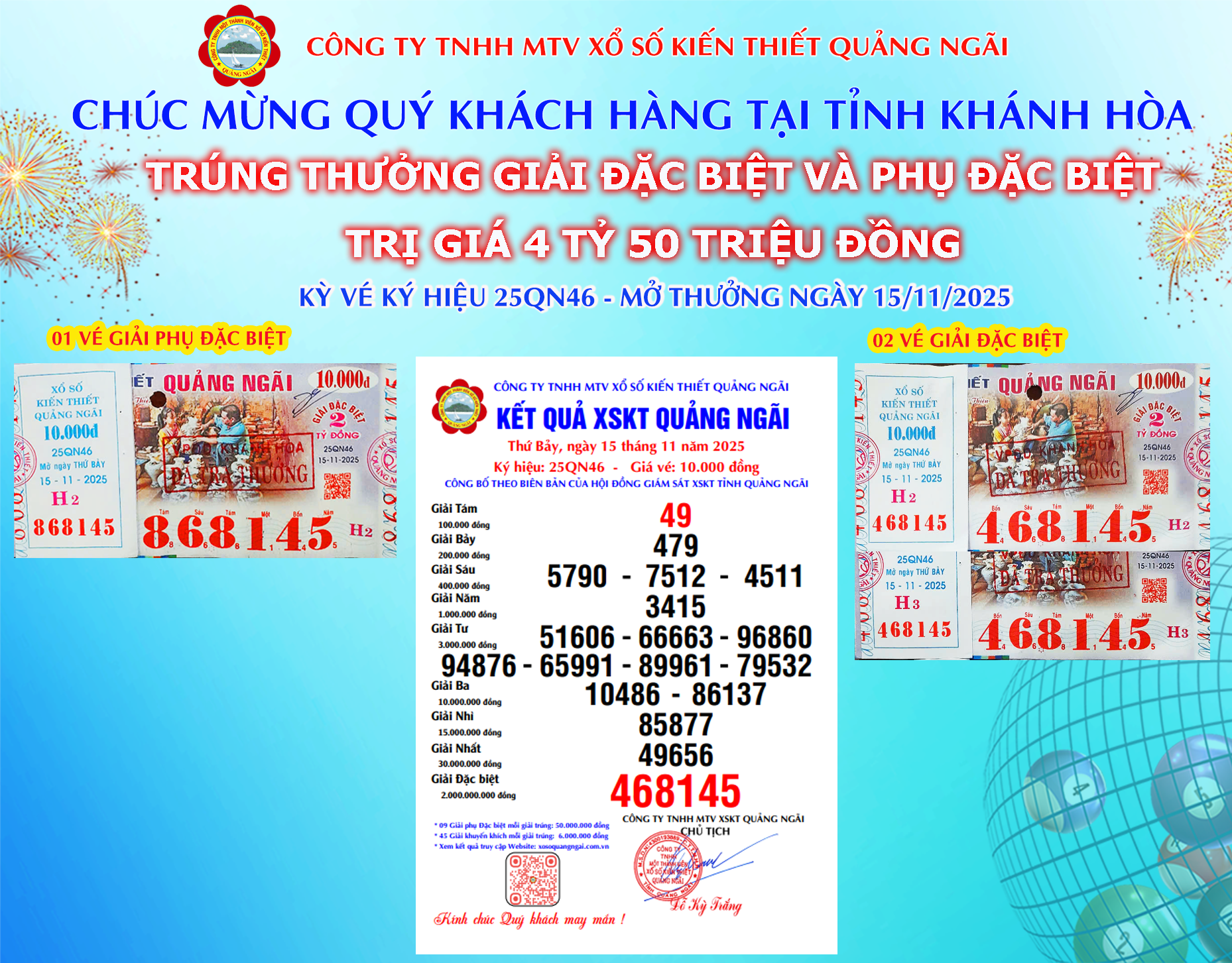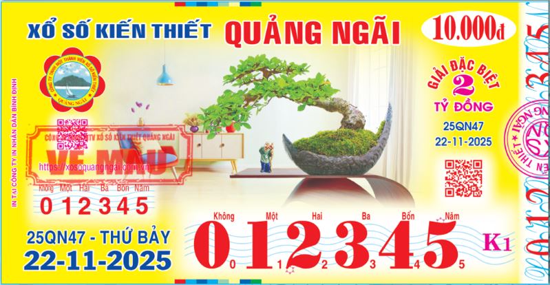 Mở thưởng Thứ Bảy ngày 22-11-2025Ký hiệu: 25QN47