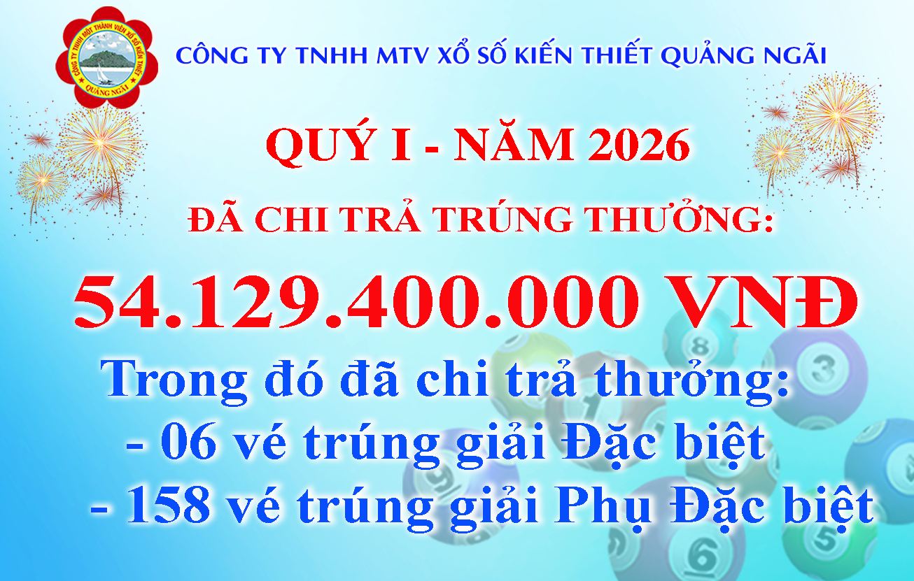 ➤ Quý I năm 2026 đã chi trả thưởng 54.129.400.000 VNĐ. Trong đó đã chi 06 tờ trúng giải Đặc biệt và 158 tờ trúng giải Phụ Đặc biệt. 20/04/2026 / Chi trả thưởng Chia sẻ