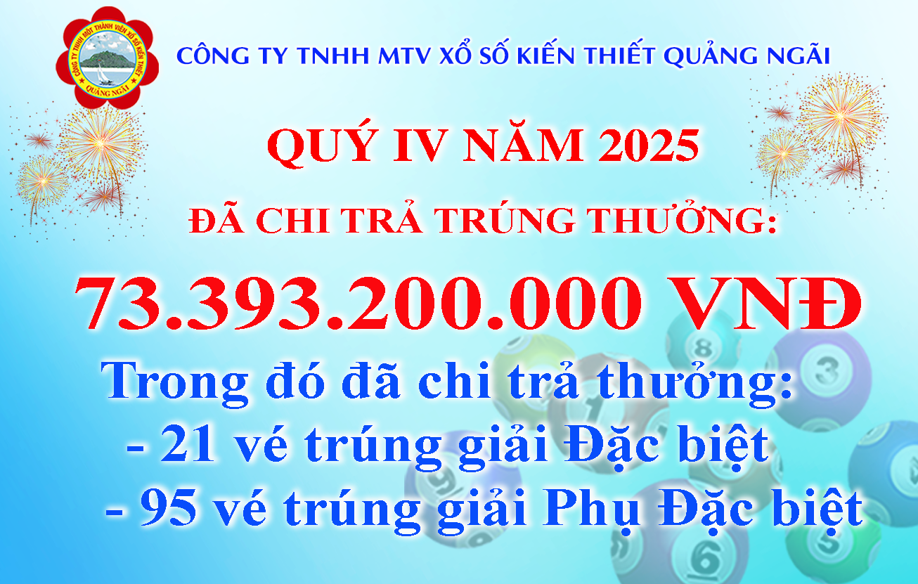 ➤ Quý IV năm 2025 đã chi trả thưởng 73.393.200.000 VNĐ. Trong đó đã chi 21 tờ trúng giải Đặc biệt và 95 tờ trúng giải Phụ Đặc biệt. 30/01/2026 / Chi trả thưởng Chia sẻ
