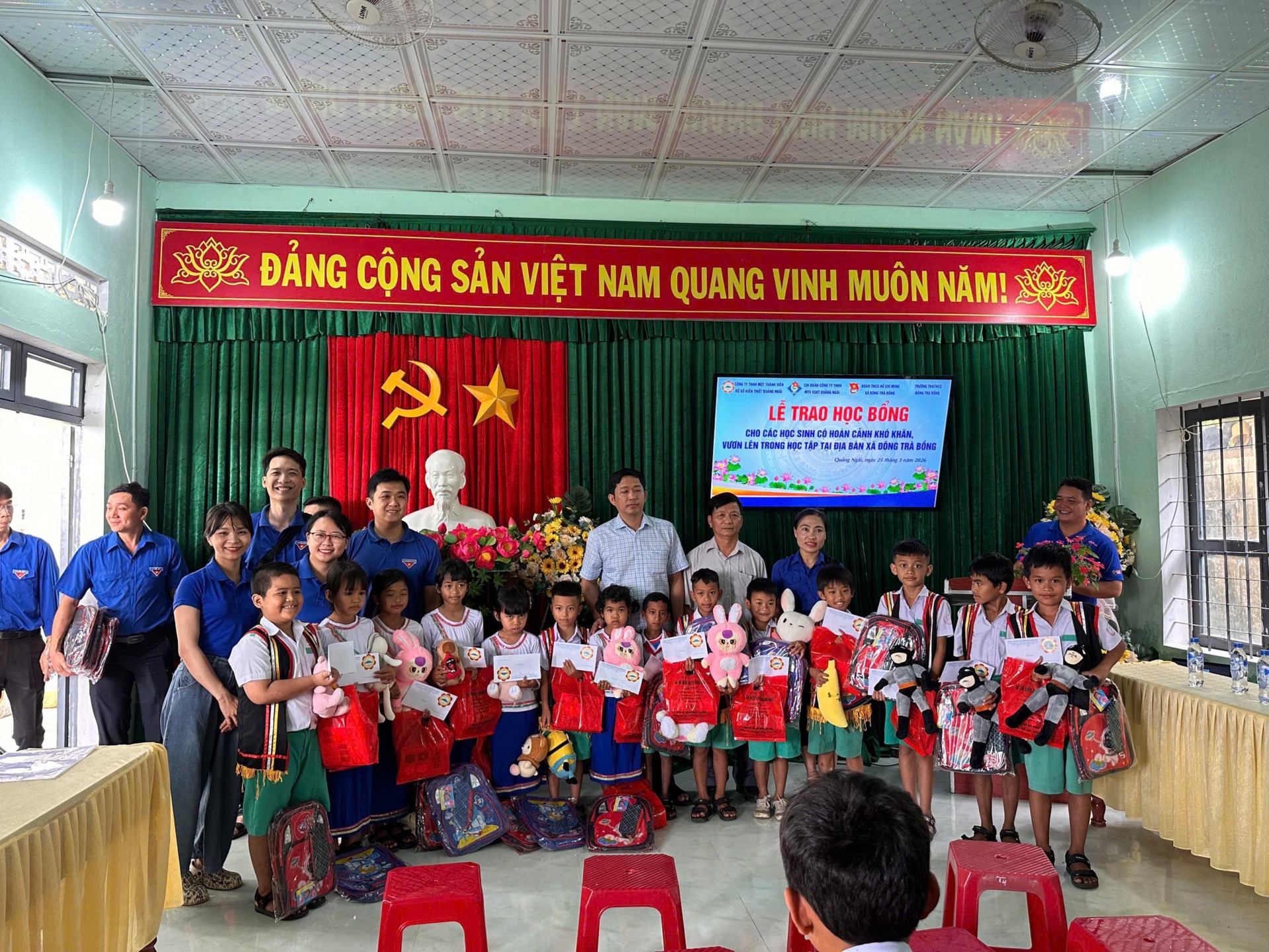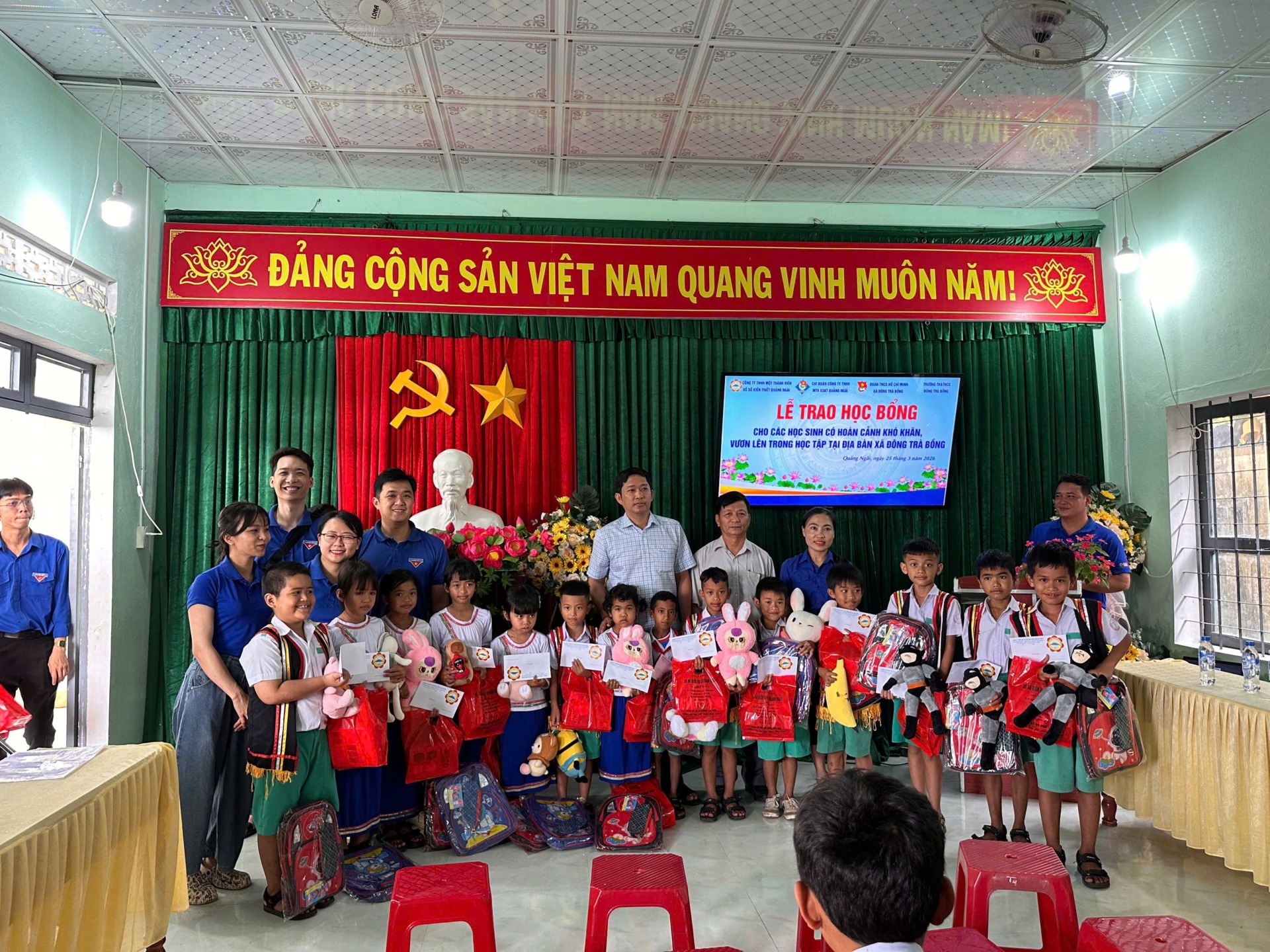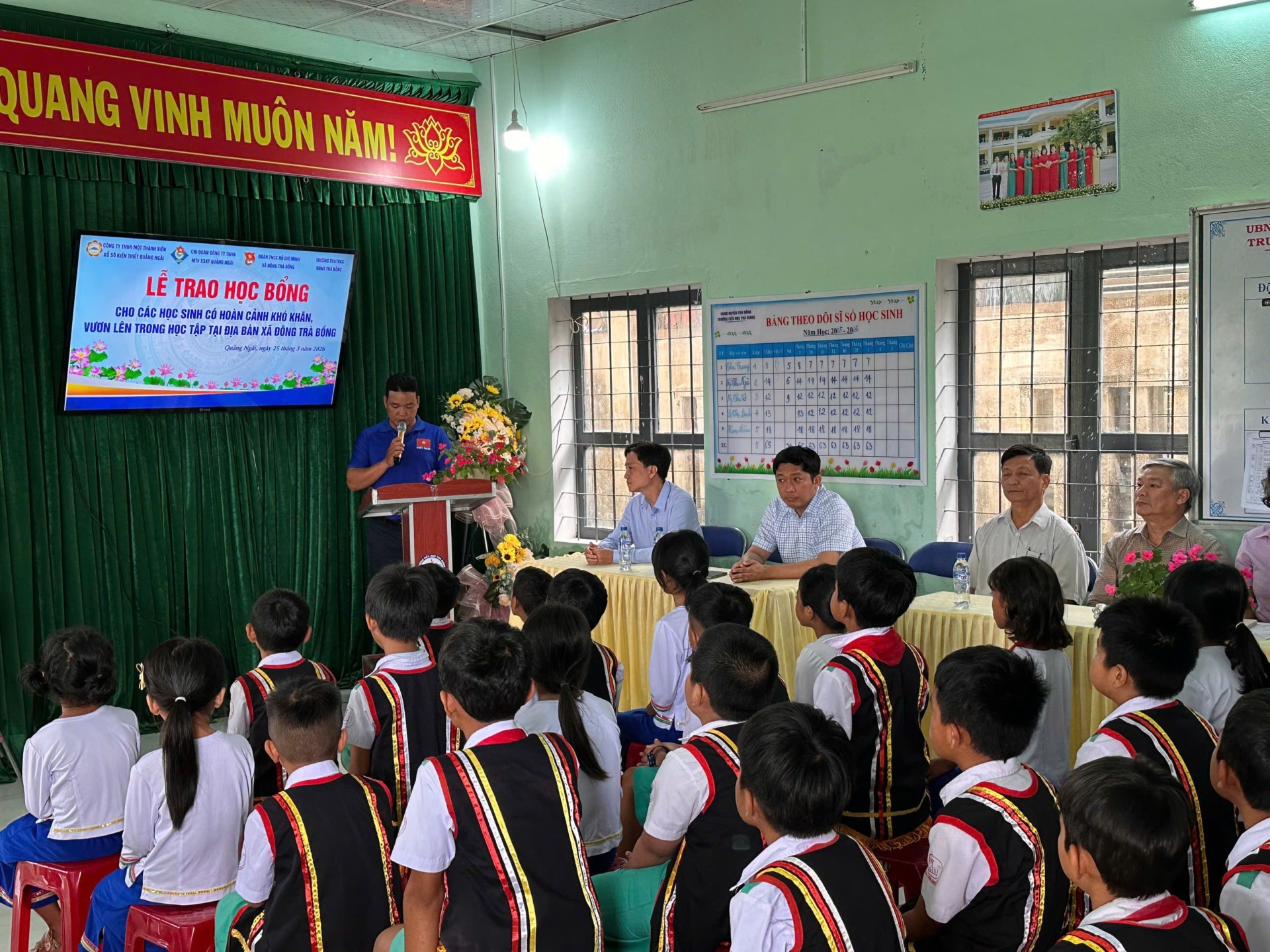 Bên cạnh hoạt động về nguồn, đoàn còn tổ chức chương trình an sinh xã hội đầy ý nghĩa tại Trường Tiểu học và THCS Đông Trà Bồng. Tại đây, đoàn đã trao tặng 26 suất học bổng cùng nhiều phần quà, dụng cụ học tập thiết thực cho các em học sinh có hoàn cảnh khó khăn, nhằm động viên, khích lệ tinh thần vượt khó vươn lên trong học tập.