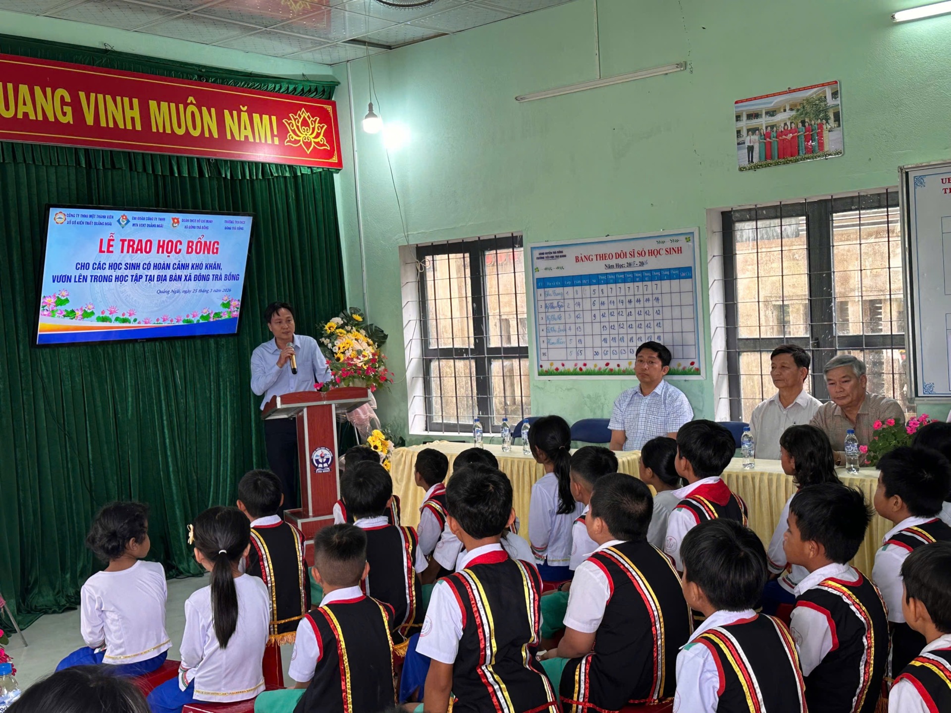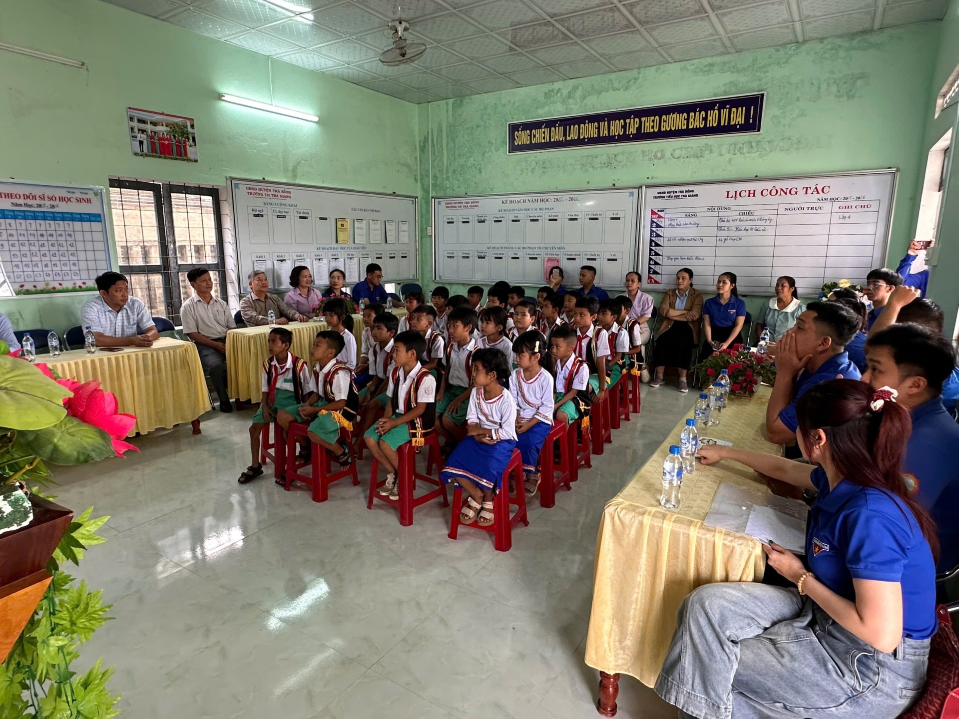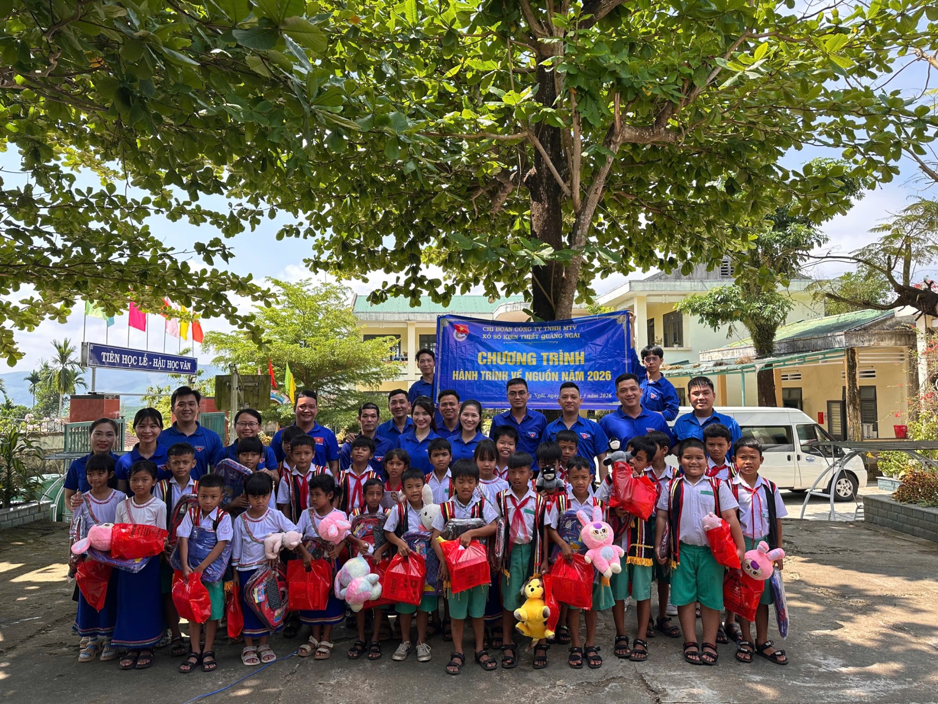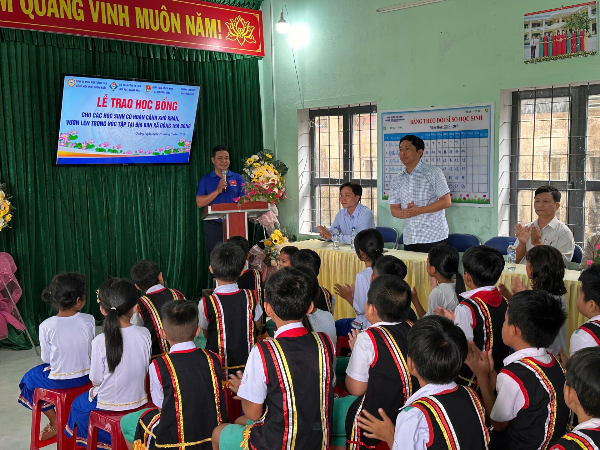 Bên cạnh hoạt động về nguồn, đoàn còn tổ chức chương trình an sinh xã hội đầy ý nghĩa tại Trường Tiểu học và THCS Đông Trà Bồng. Tại đây, đoàn đã trao tặng 26 suất học bổng cùng nhiều phần quà, dụng cụ học tập thiết thực cho các em học sinh có hoàn cảnh khó khăn, nhằm động viên, khích lệ tinh thần vượt khó vươn lên trong học tập.