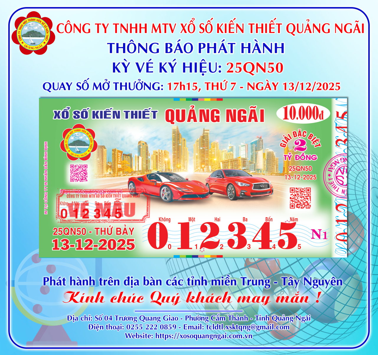 Thông báo phát hành Bộ vé Ký hiệu 25QN50 – Mở thưởng Thứ 7, ngày 13/12/2025 Thông báo phát hành Bộ vé Ký hiệu 25QN50 – Mở thưởng Thứ 7, ngày 13/12/2025 Chi tiết »