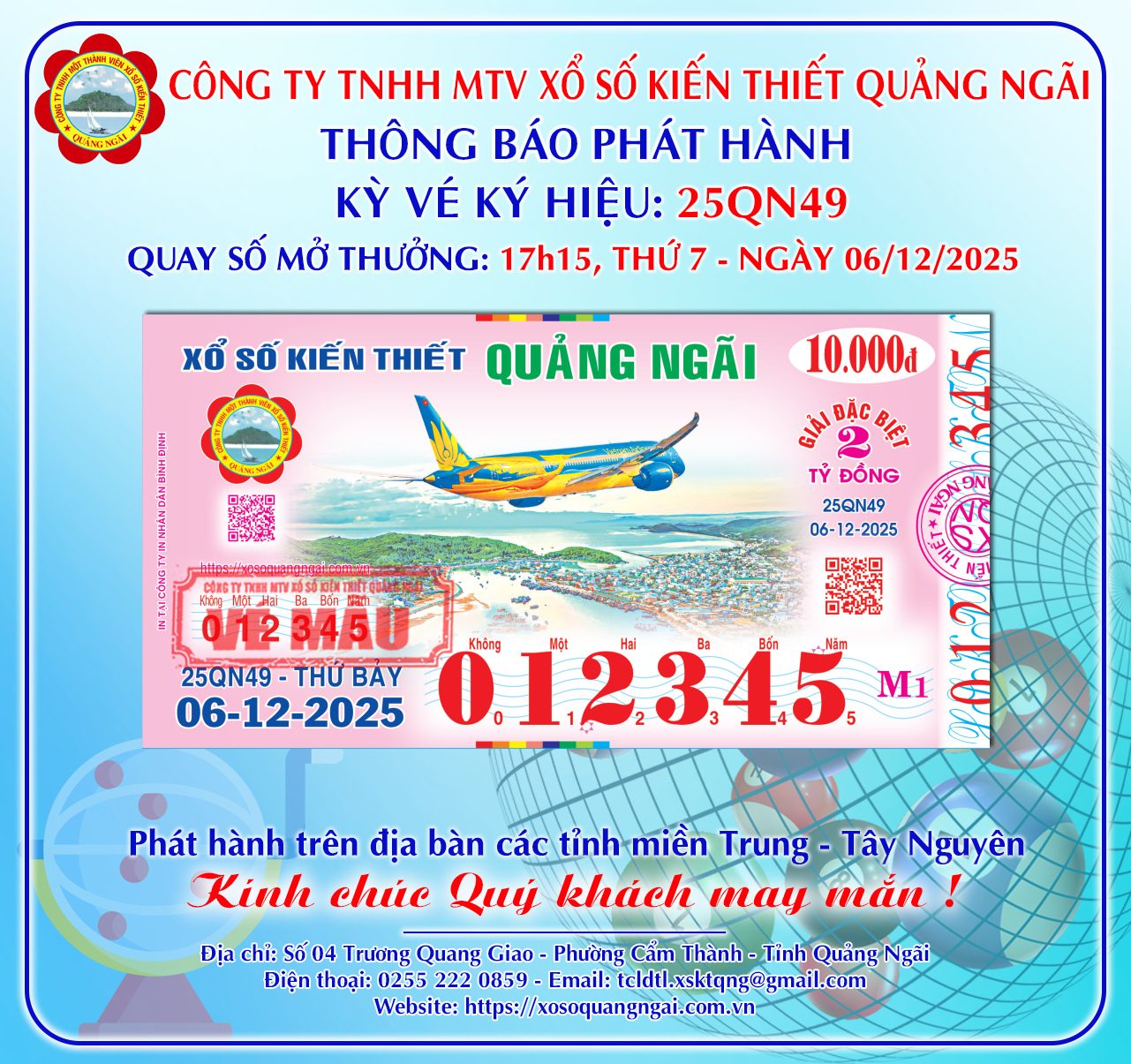 Thông báo phát hành Bộ vé Ký hiệu 25QN49 – Mở thưởng Thứ 7, ngày 06/12/2025 05/12/2025 / Thông báo phát hành Chia sẻ