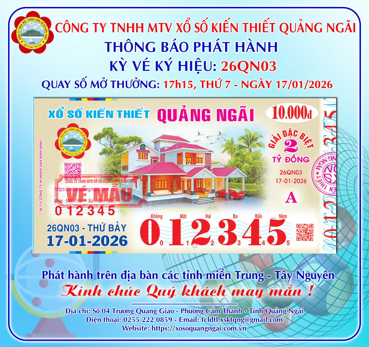 Thông báo phát hành Bộ vé Ký hiệu 26QN03 – Mở thưởng Thứ 7, ngày 17/01/2026 16/01/2026 / Thông báo phát hành Chia sẻ