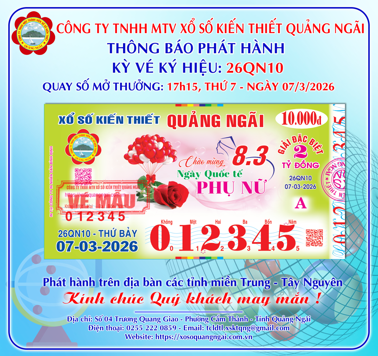 Thông báo phát hành Bộ vé Ký hiệu 26QN10 – Mở thưởng Thứ 7, ngày 07/3/2026 06/03/2026 / Tin tức Chia sẻ