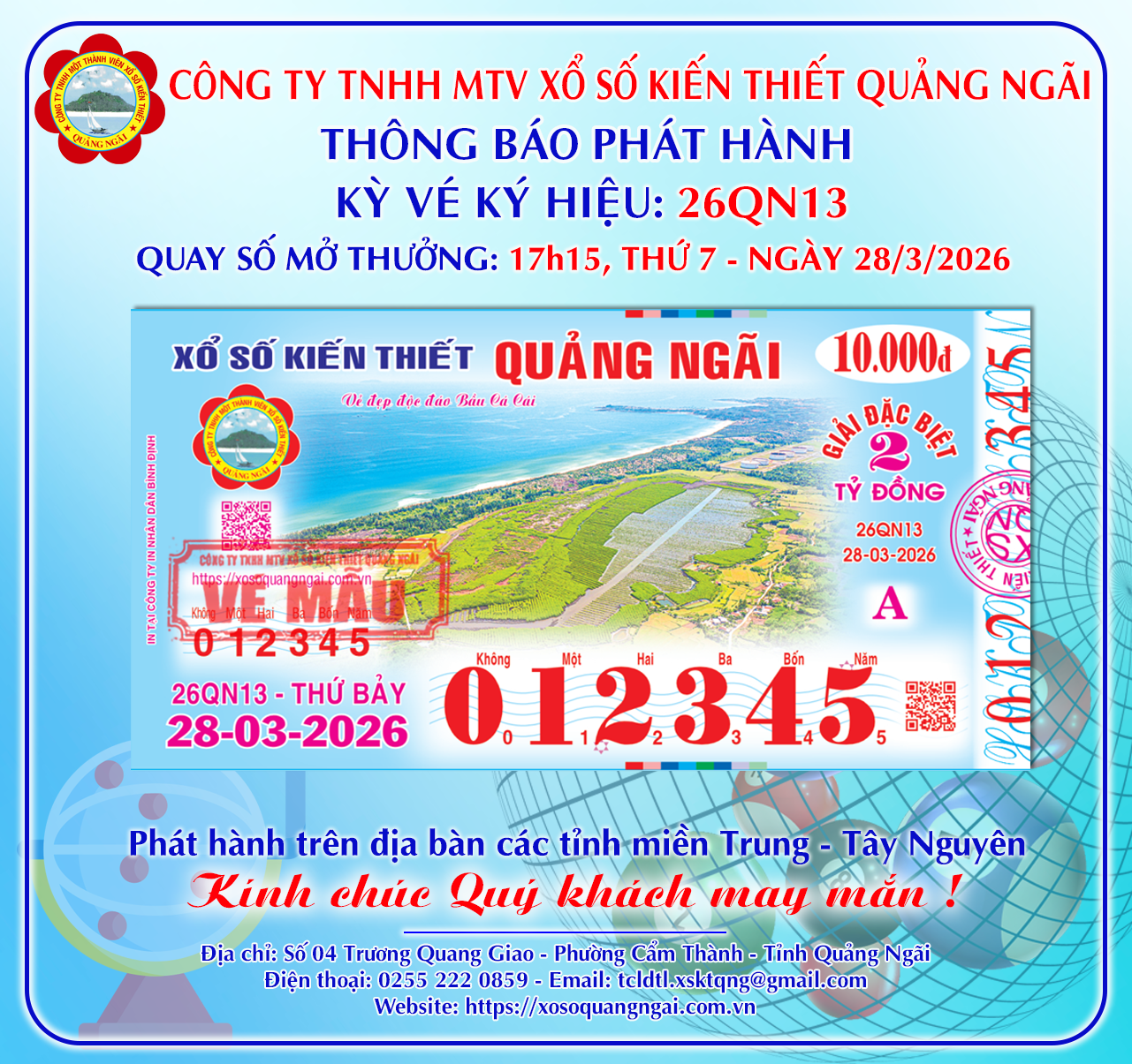 Thông báo phát hành Bộ vé Ký hiệu 26QN13 – Mở thưởng Thứ 7, ngày 28/3/2026 27/03/2026 / Thông báo phát hành Chia sẻ